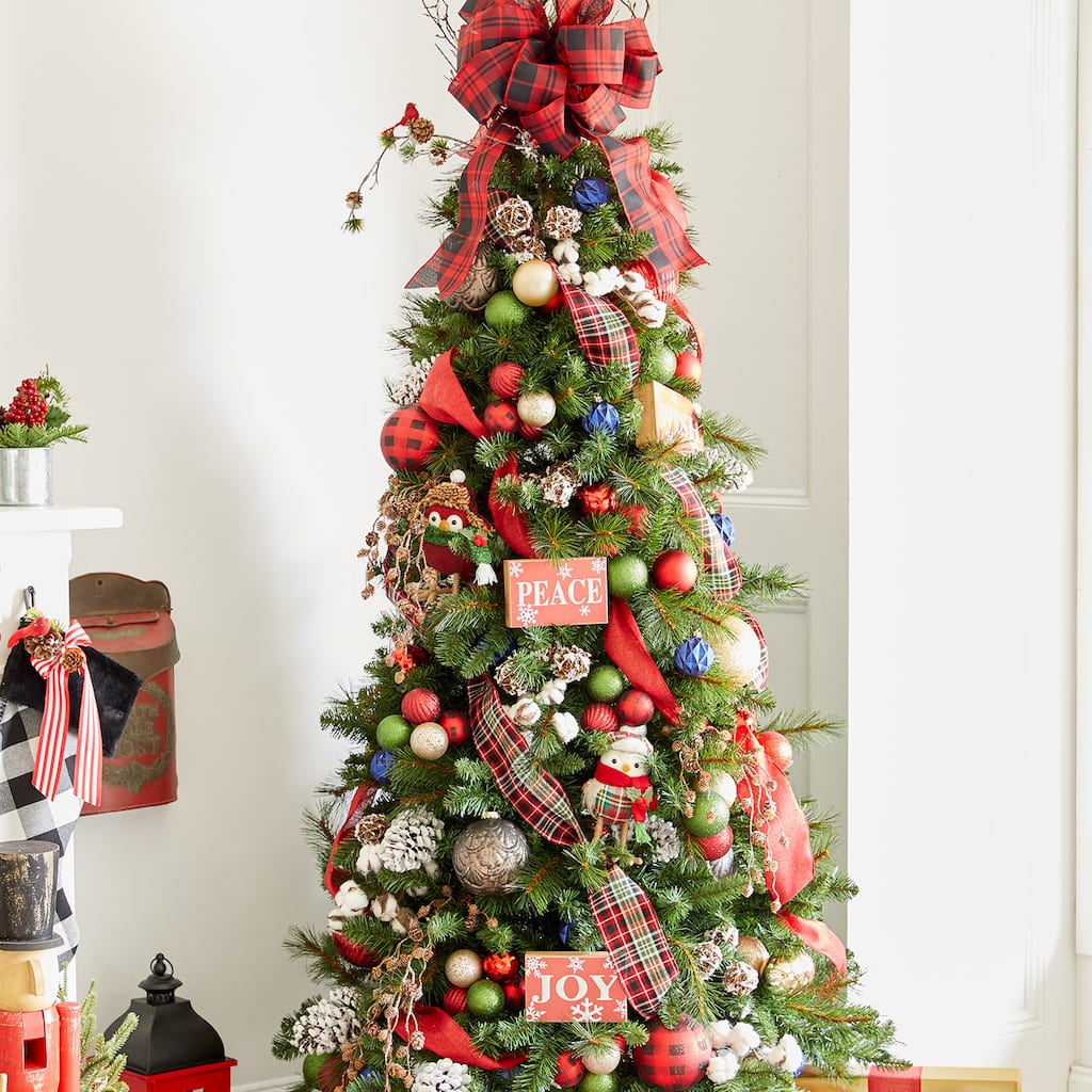 Guardate lo slim tree di Michael’s (Il top delle decorazioni da queste parti è lui!): il nastro scende comparendo e scomparendo fra le trame dell’albero. Questo gioco darà spazio alle altre decorazioni e risalterà le diverse sfumature prodotte dalle luci.
